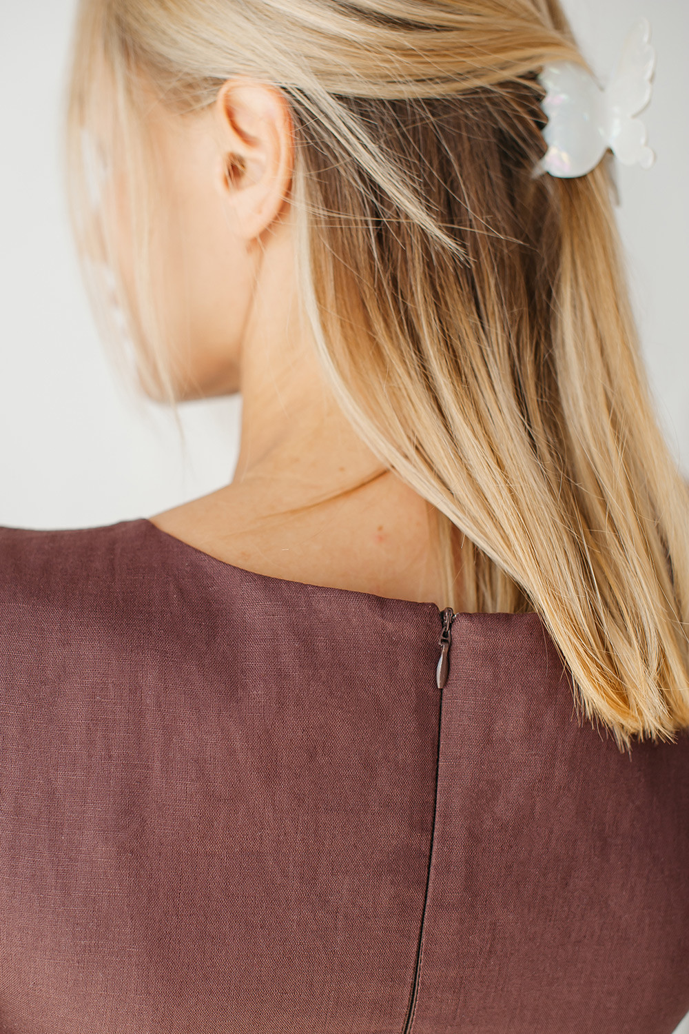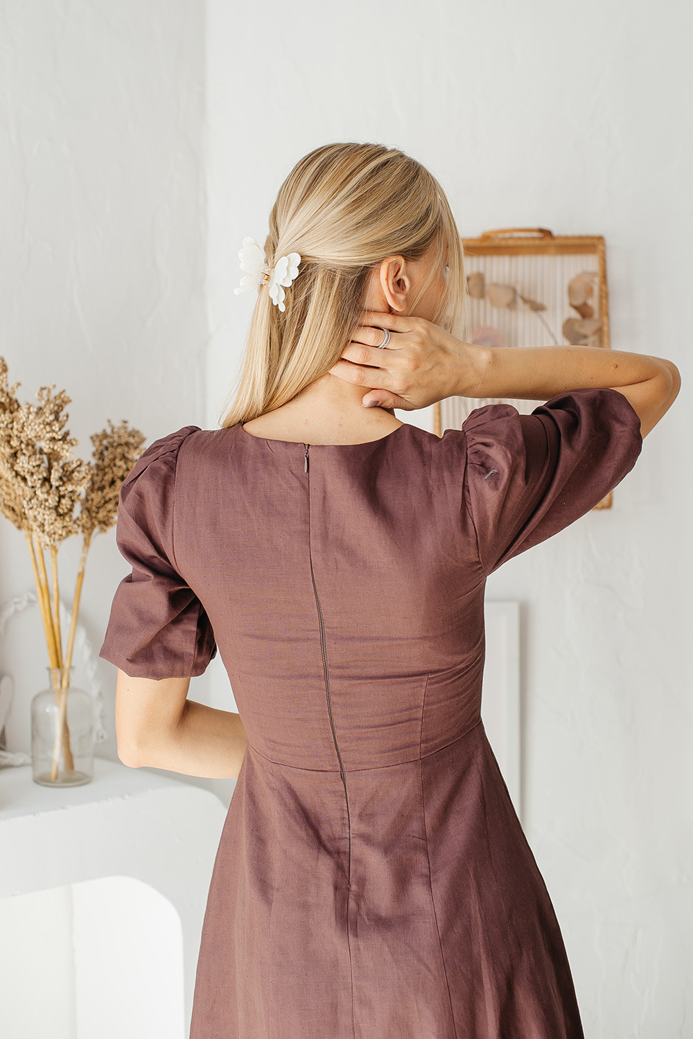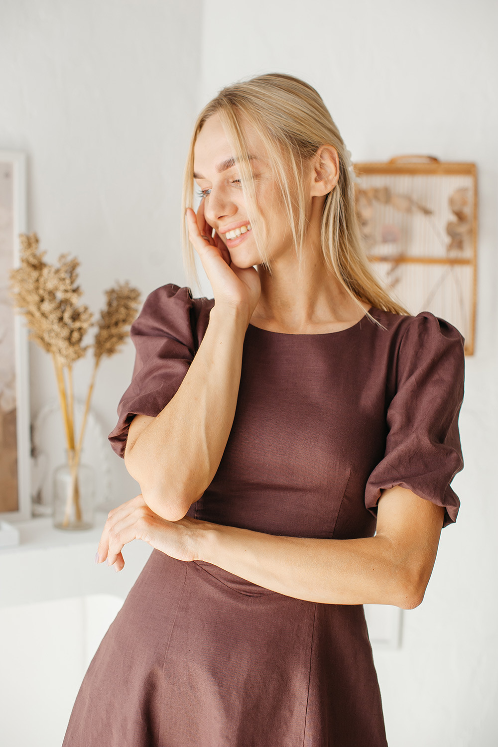 Її насичений шоколадний відтінок підкреслює теплоту шкіри, а природна фактура льону створює відчуття спокою й впевненості.