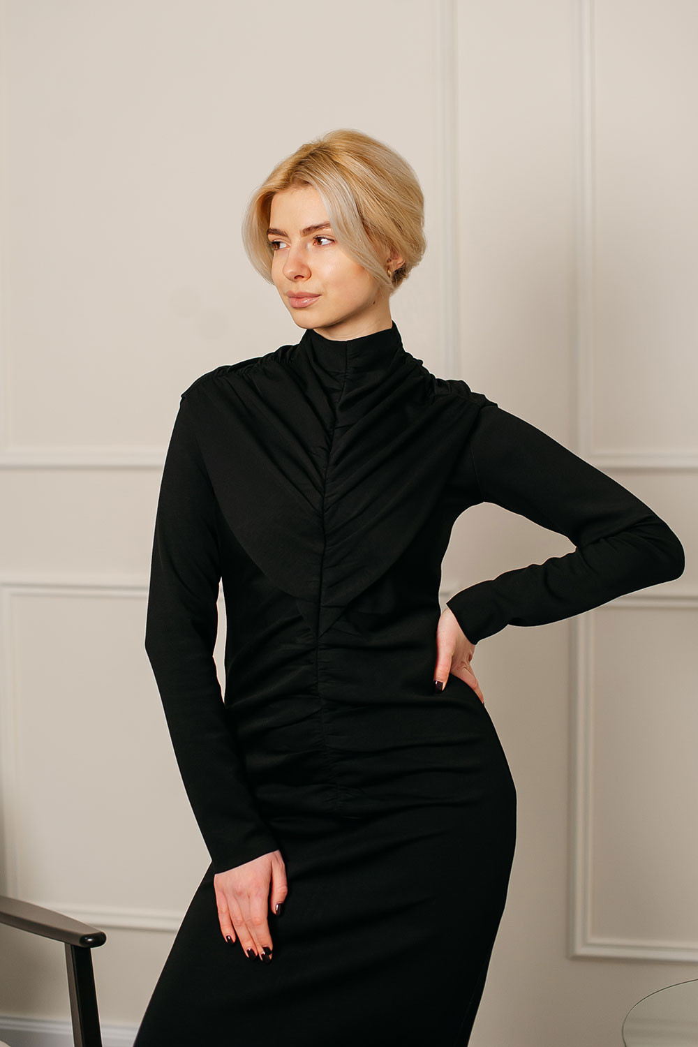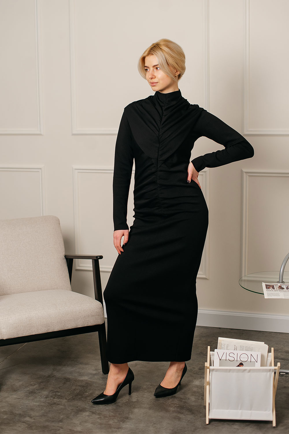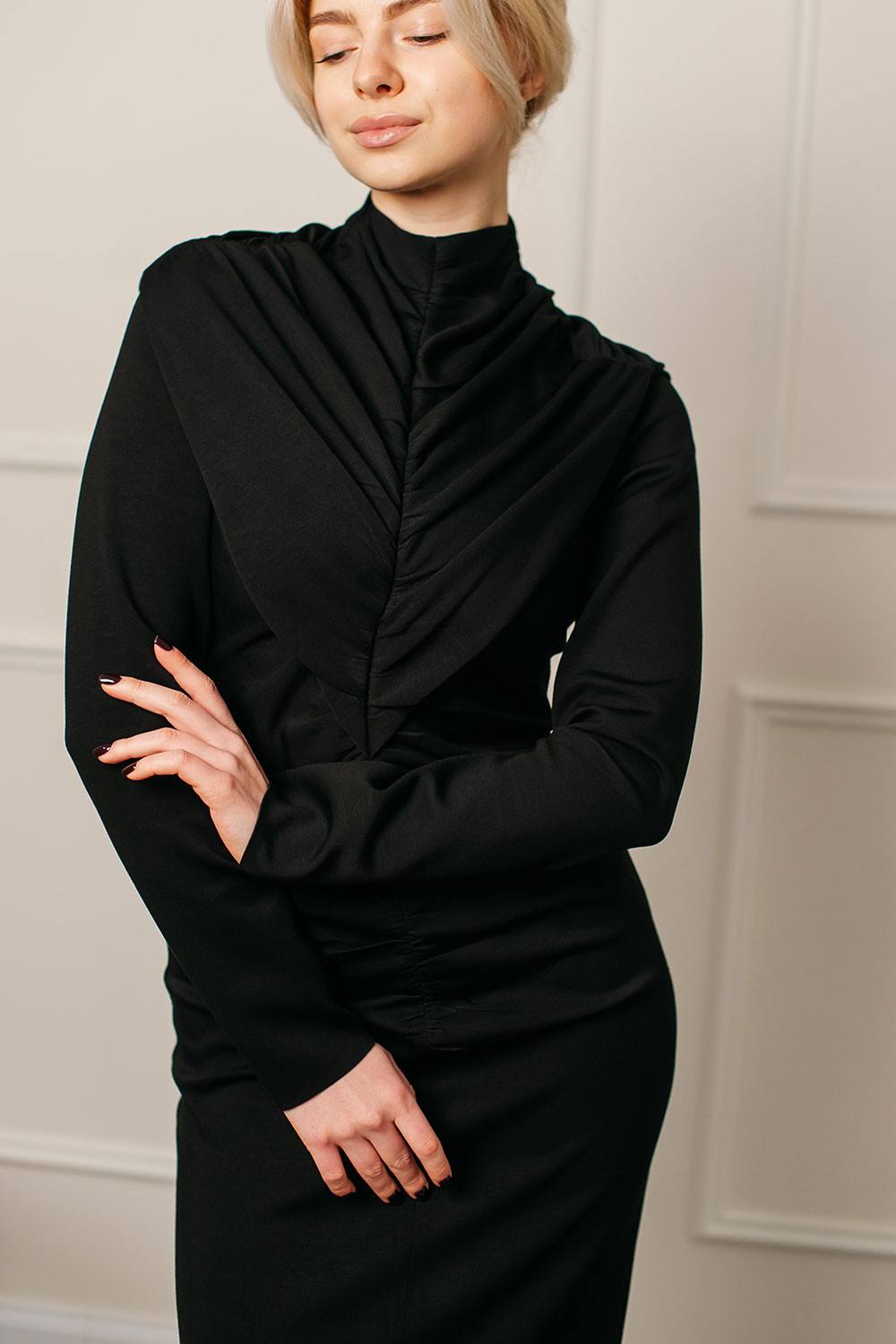 Драпірування м’яко моделює талію, а довжина додає образу елегантності та витриманої жіночності.
