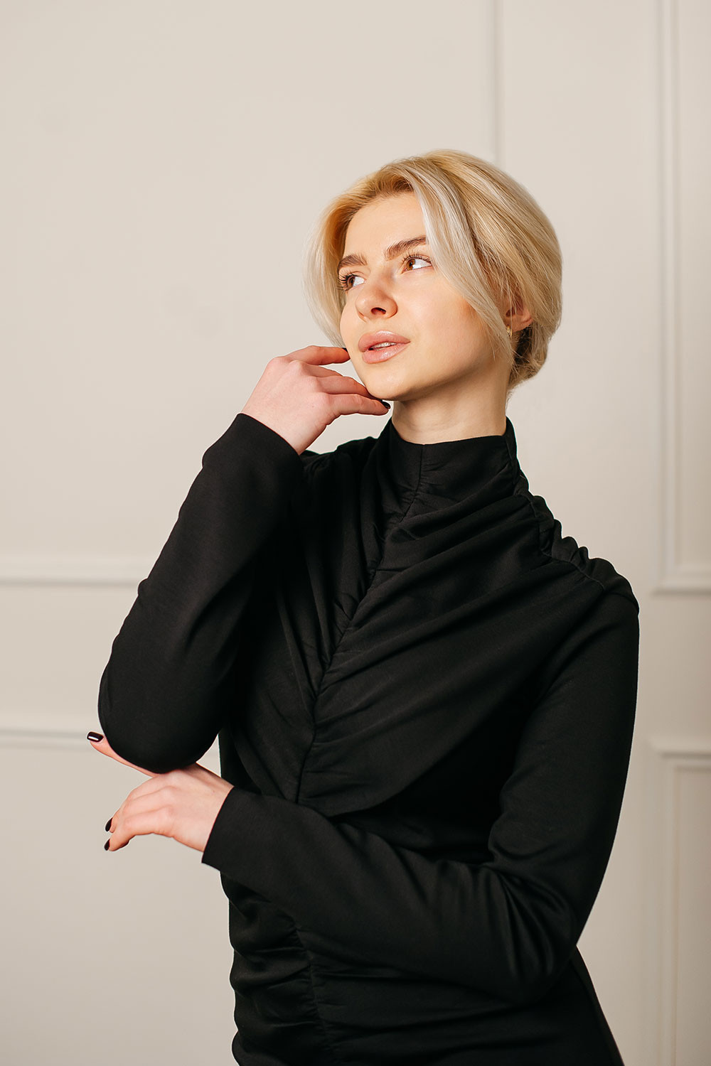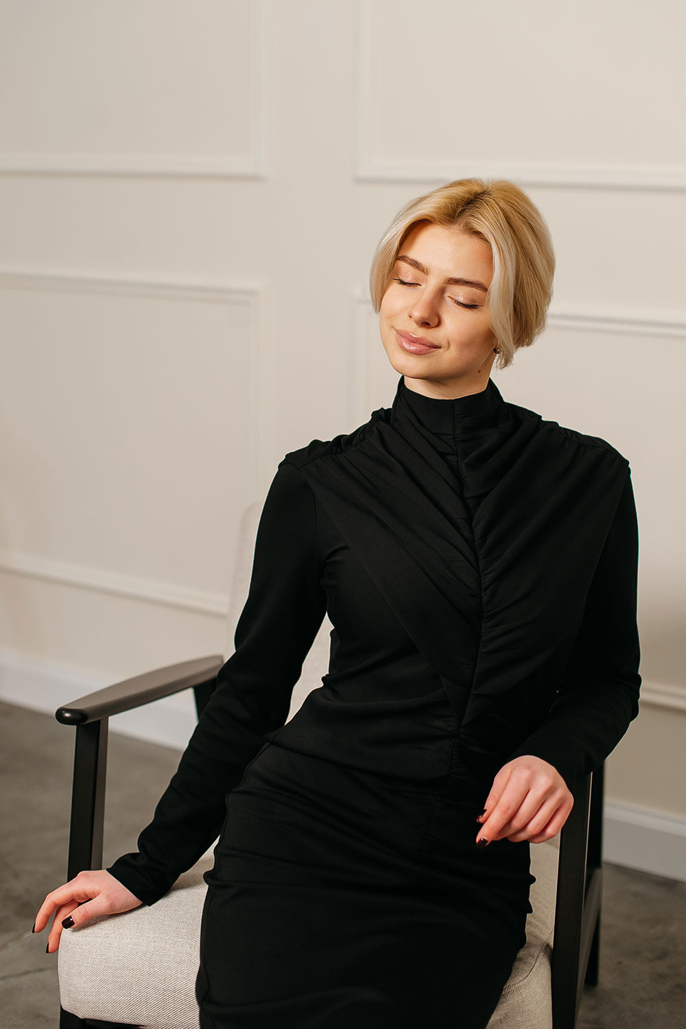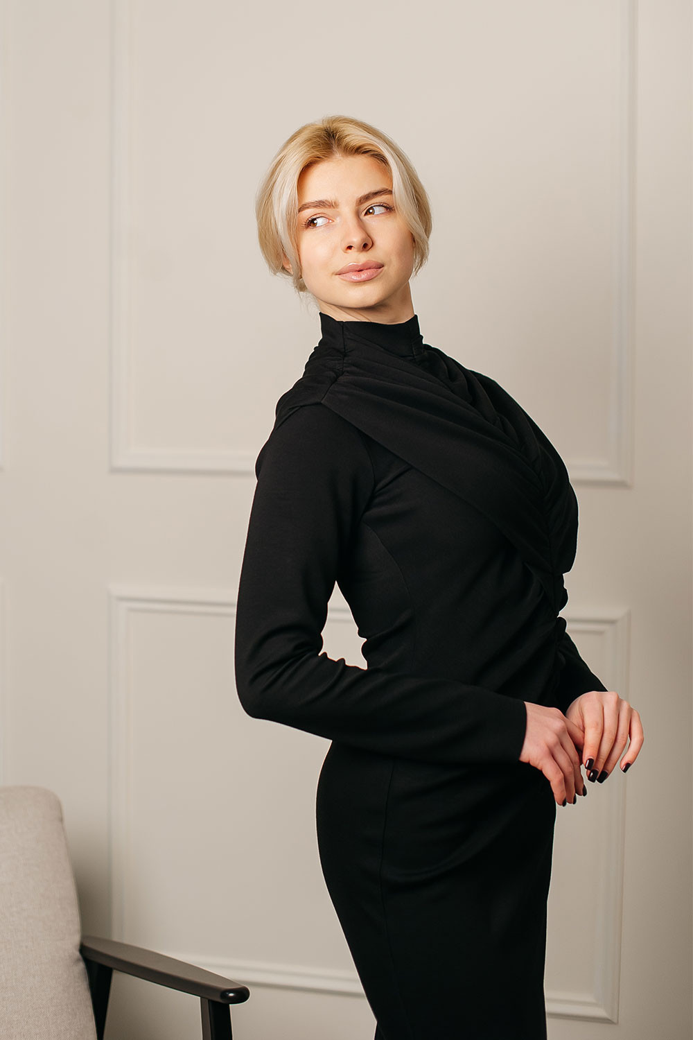 Драпірування м’яко моделює талію, а довжина додає образу елегантності та витриманої жіночності.